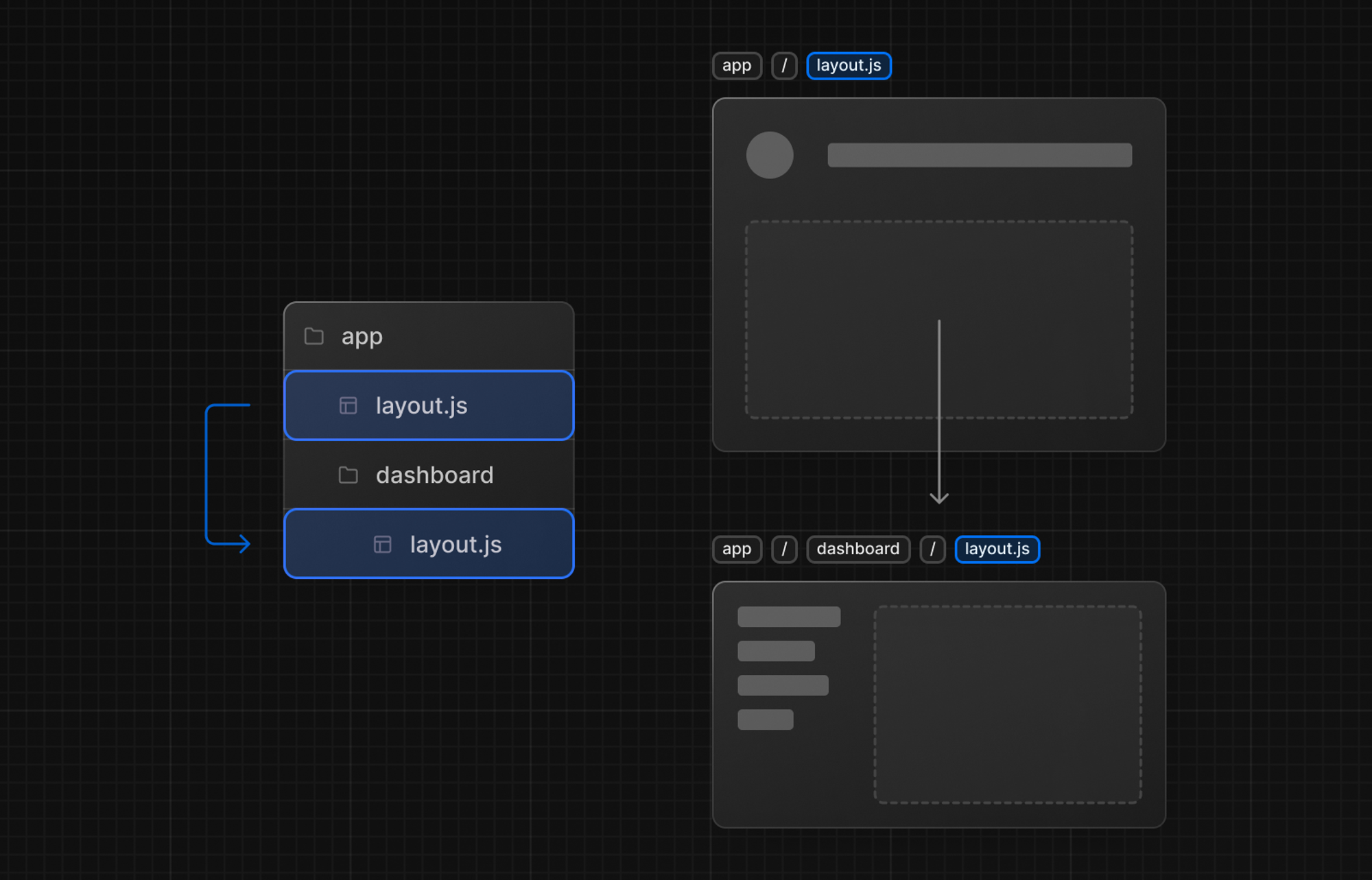 폴더 내에 정의된 레이아웃(예: app/dashboard/layout.js)은 특정 경로 세그먼트(예: acme.com/dashboard)에 적용되고 해당 세그먼트가 활성화될 때 렌더링됩니다. 기본적으로 파일 계층 구조의 레이아웃은 중첩됩니다. 즉, child props 통해 자식 레이아웃을 래핑합니다.