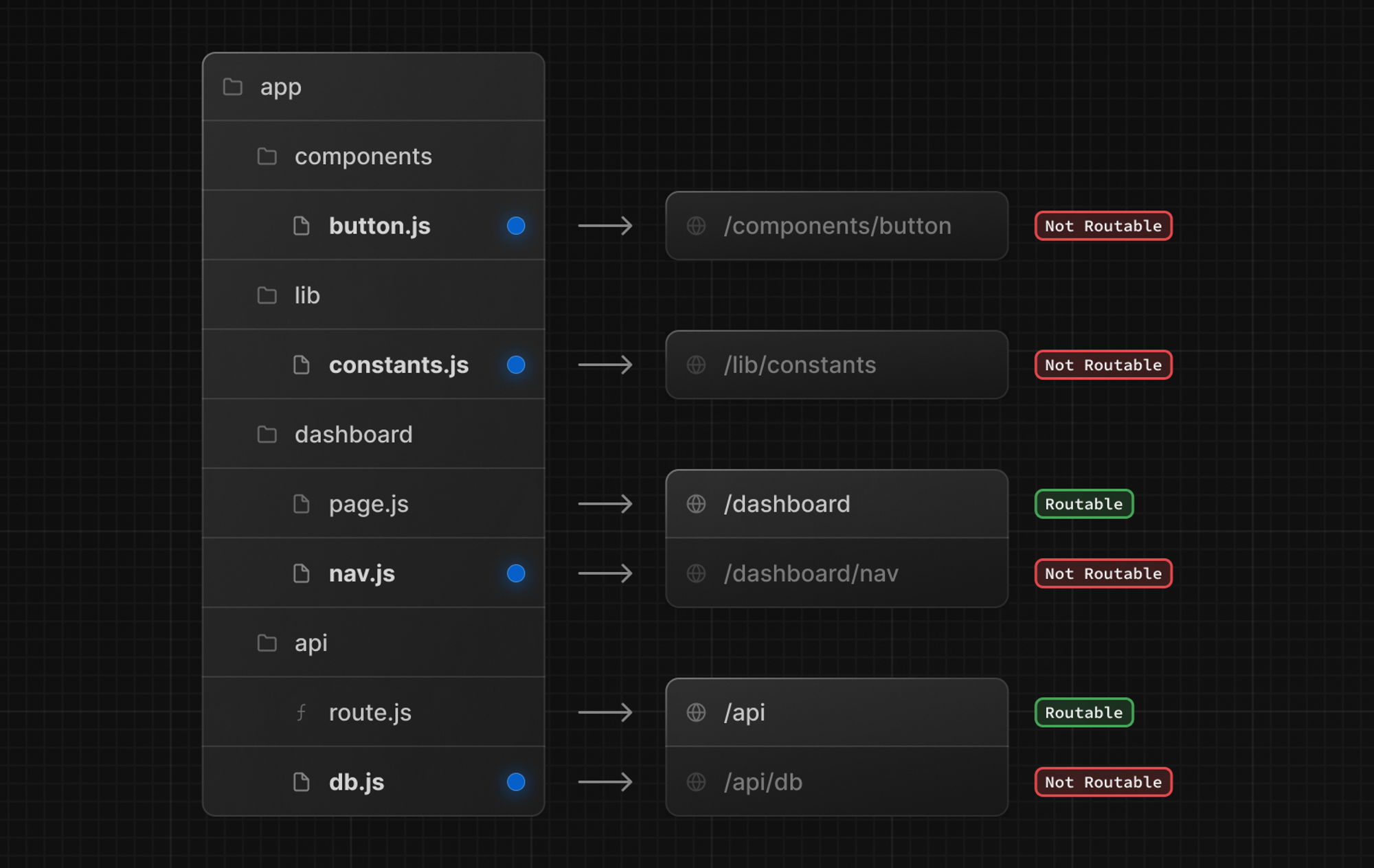 폴더가 경로를 정의하는 동안 page.js 또는 route.js에서 반환된 콘텐츠만 공개적으로 주소 지정이 가능하기 때문에 특수 파일 외에도 앱 디렉토리의 폴더 안에 고유한 파일(예: components, styles, tests etc 등)을 함께 배치할 수 있는 옵션이 있습니다.