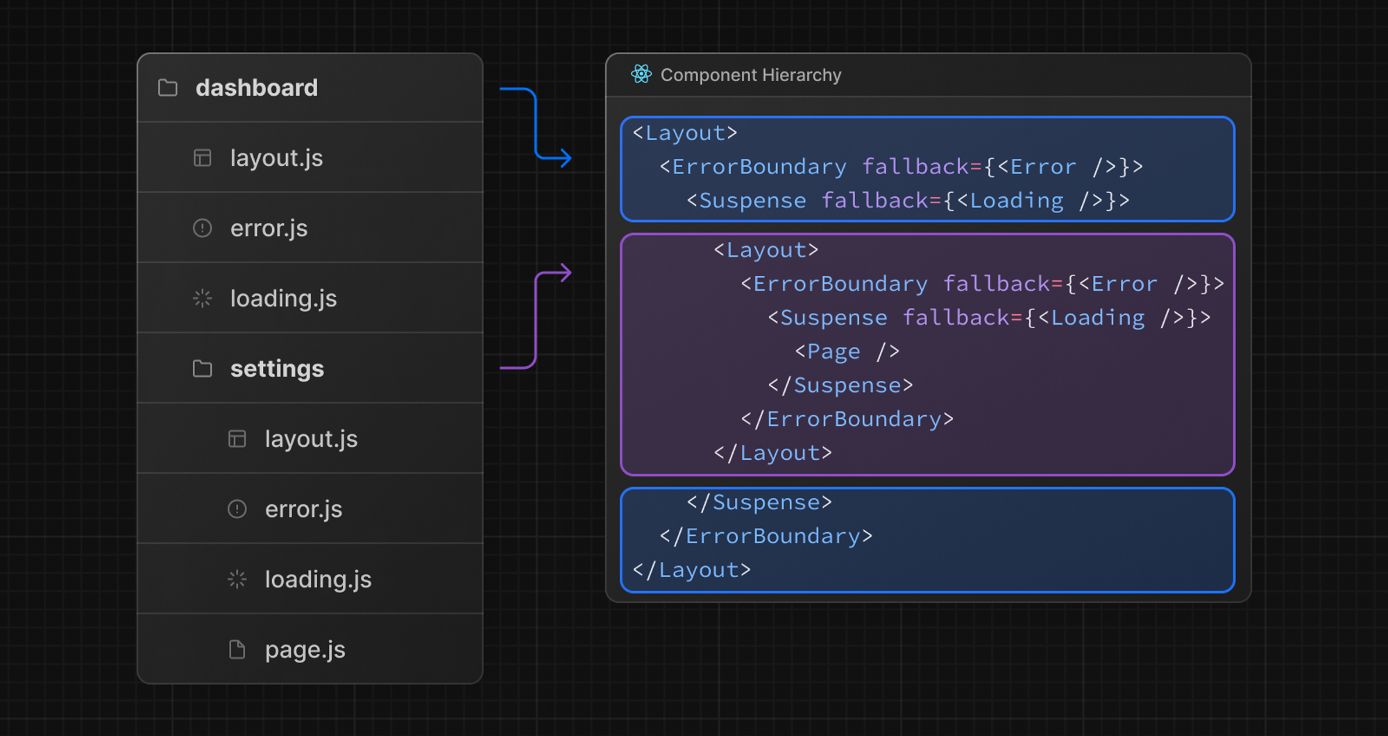 경로 세그먼트의 특수 파일에 정의된 React 구성 요소는 특정 계층 구조로 렌더링됩니다.
