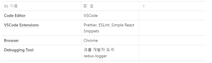 다음 표는 제가 React를 개발하면서 이용한 개발 툴입니다. 개발툴 선택은 개인의 취향에 맞게 사용하면 되지만 React에서도 권장하는 사항이므로 추천합니다.