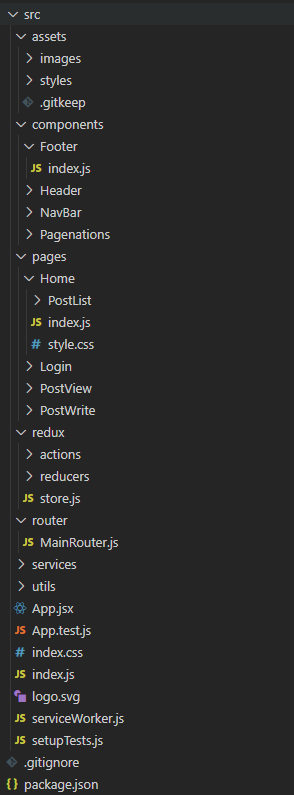 - react-router의 path와 동일한 이름을 갖는 컴포넌트들을 관리합니다. page를 사용자 도메인에 맞춰서 관리하게 되면 전체적인 프로젝트 구조를 한눈에 알아보기 쉽고, 해당 페이지의 문제되는 코드까지 이동하는 시간을 단축 할 수 있습니다.